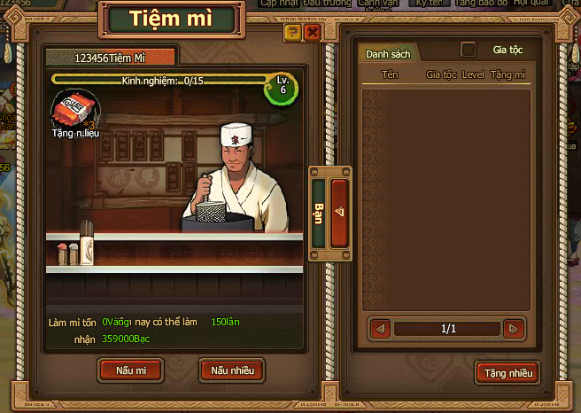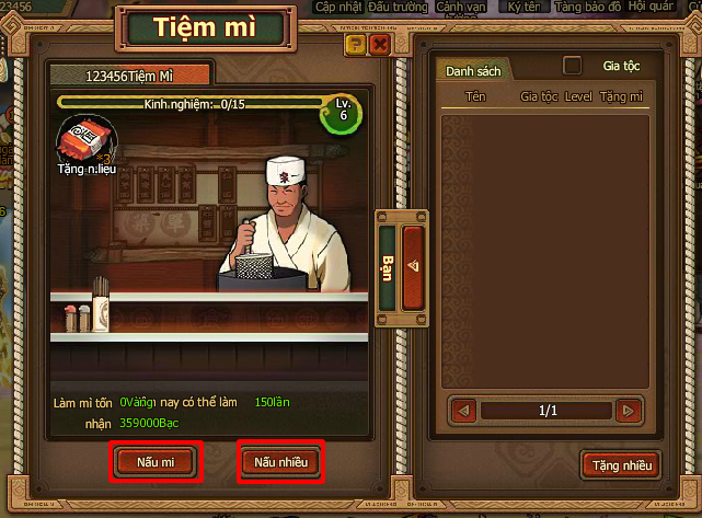 Tại tiệm mì mỗi lần tiến hành nấu mì thì quý ninja sẽ nhận được bạc, có 2 nút là "Nấu Mì" và "Nấu Nhiều"