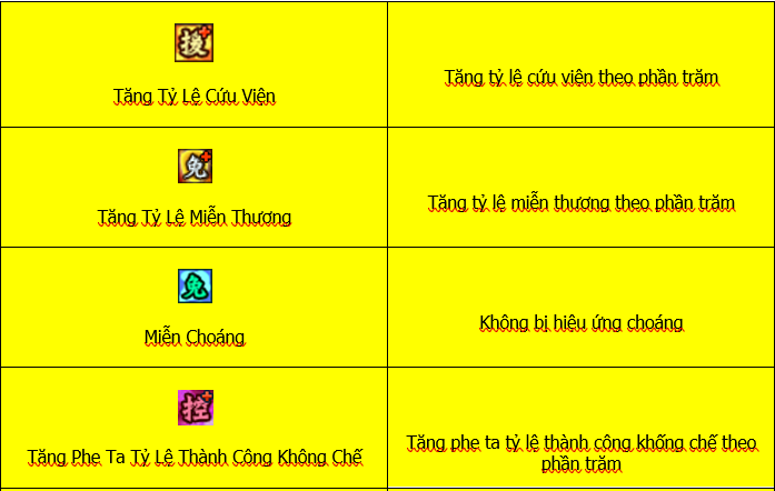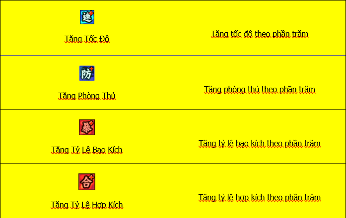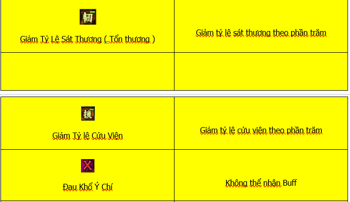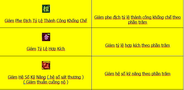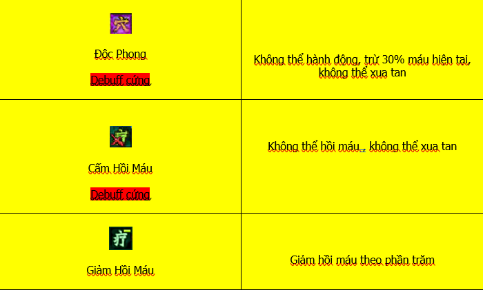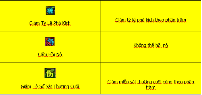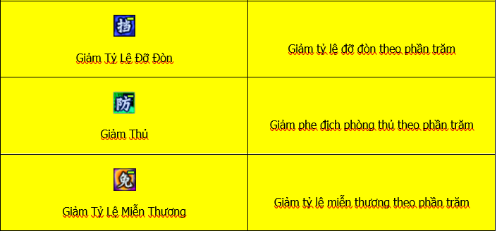 + Các hiệu ứng DeBuff trái ngược với hiệu ứng Buff các hiệu ứng này sẽ gây ảnh hưởng xấu đến các chỉ số của team địch, ví dụ các như các hiệu ứng giảm vật công, phòng thủ,tốc độ.