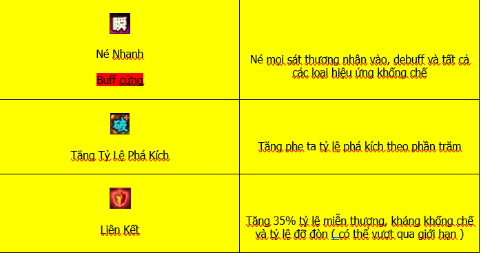 + Các hiệu ứng Buff hiểu đơn giản là có tác dụng gia tăng sức manh hoặc tốc đô, thể lực của đồng đội, có thể kể đến các buff như tăng vật công, tăng tốc, tăng máu, tăng thủ.