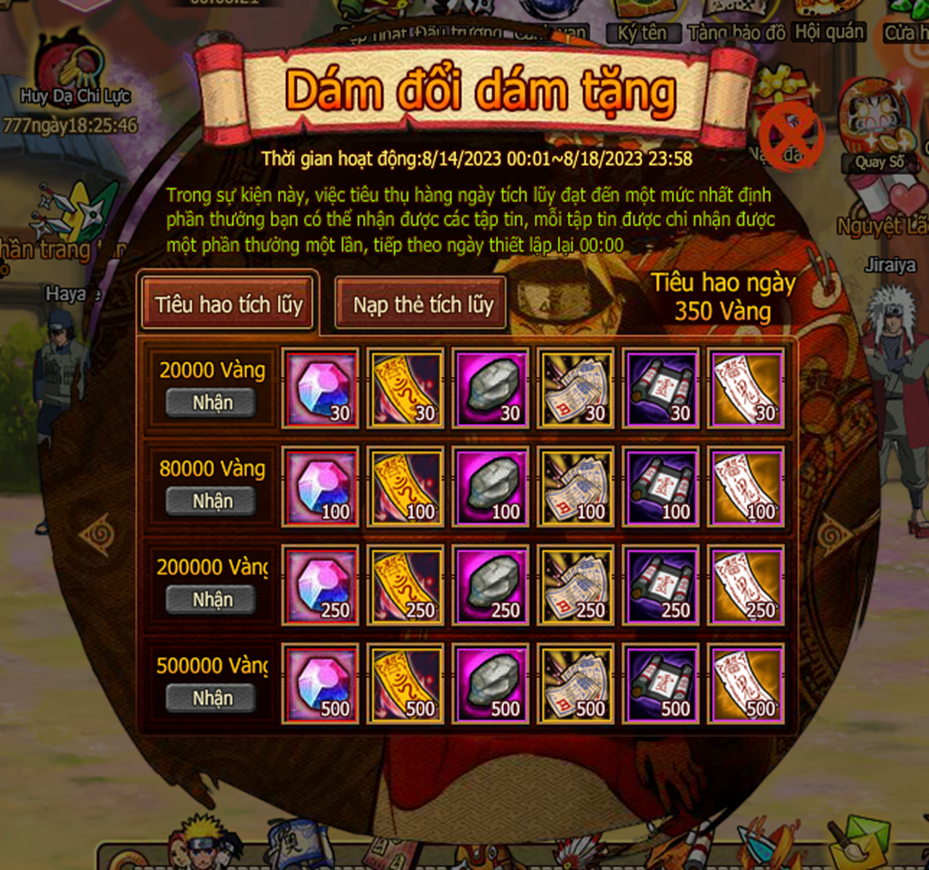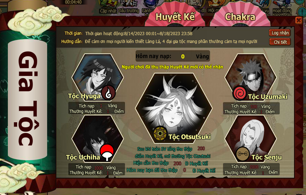 1. Trong thời gian hoạt động mỗi ngày tích lũy nạp đủ mốc tương ứng, mở 4 đại gia tộc, nhận thưởng Huyết kế tương ứng. 4 đại gia tộc gồm: Tộc Hyuga, Tộc Uzumaki, Tộc Uchiha, Tộc Senju.