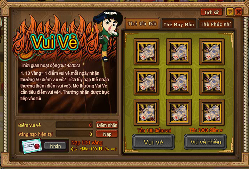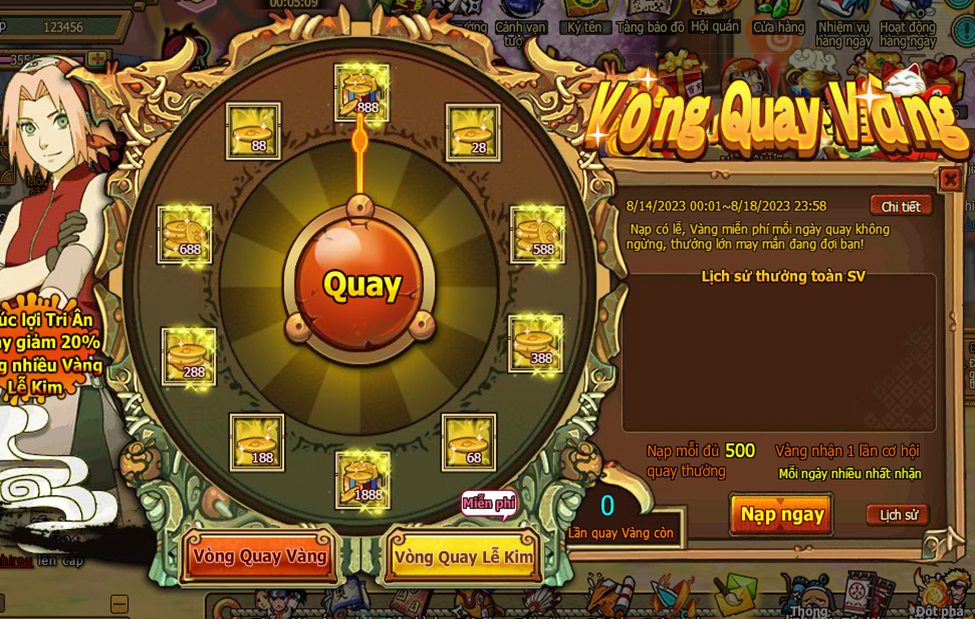 1. Trong thời gian event , người chơi nạp đủ 500 vàng nhận 1 lần cơ hội quay (vòng quay vàng)