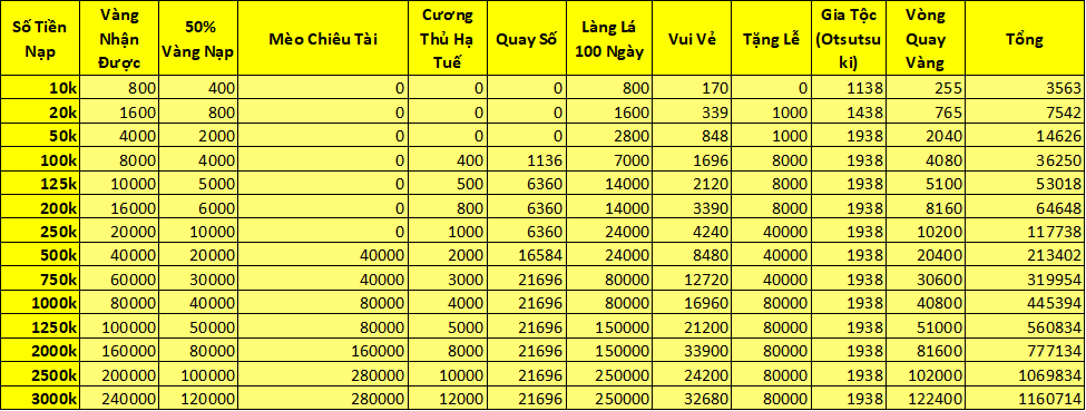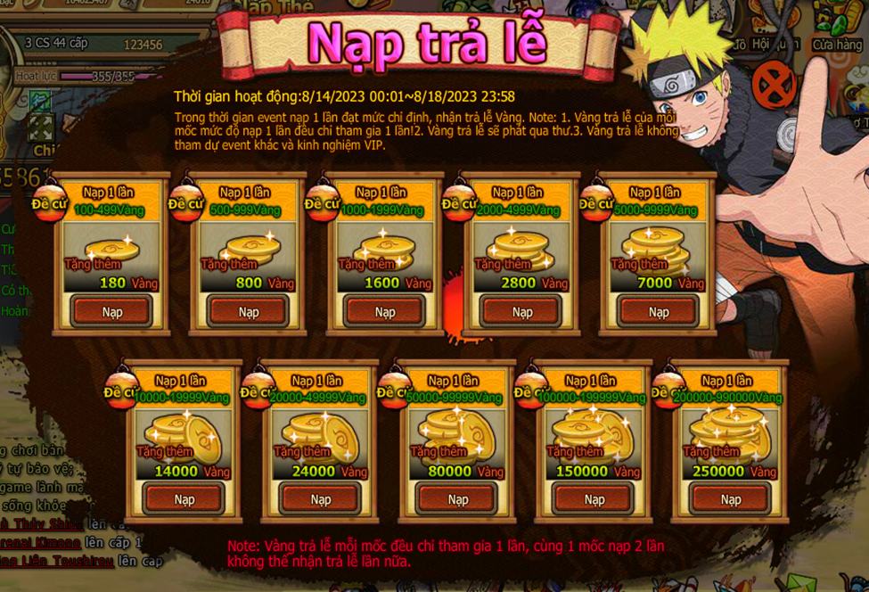 Trong thời gian event nạp 1 lần đạt mức chỉ định , nhận trả lễ vàng .