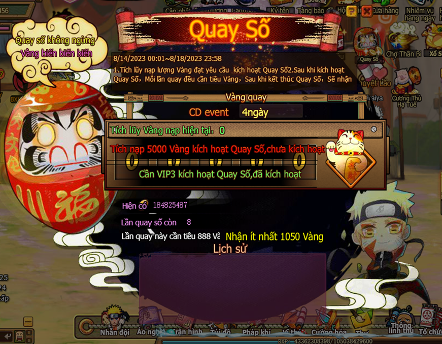 3. Trong thời gian event , người chơi tiêu đủ 1000 vàng nhận 1 lần cơ hội vòng quay lễ kim , mỗi ngày nhiều nhất có thể nhận 20 lần