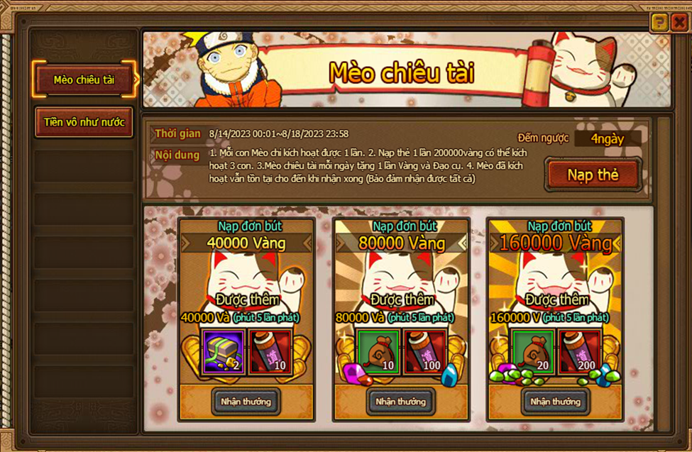 3. Mèo chiêu tài mỗi ngày tặng 1 lần Vàng và đạo cụ.
