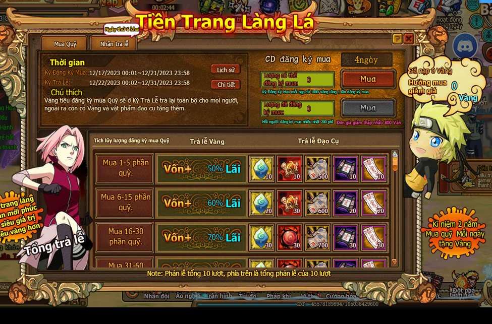Người chơi căn cứ số phần mua Quỹ mỗi ngày nhận 1 lần Quỹ thưởng trả lễ , trả lễ bao gồm trả lễ vàng và đạo cụ