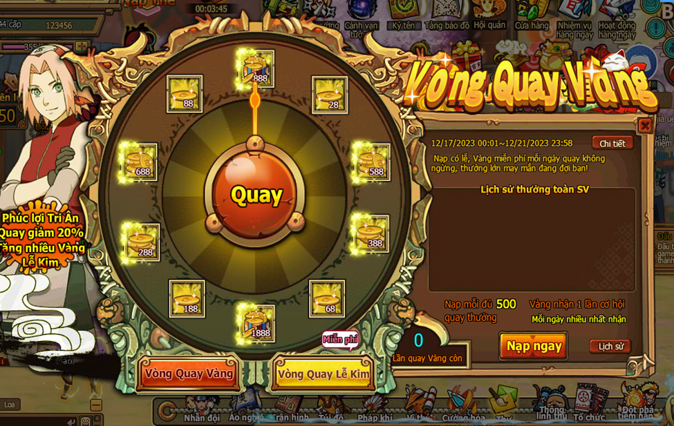 1. Trong thời gian event , người chơi nạp đủ 500 vàng nhận 1 lần cơ hội quay (vòng quay vàng)