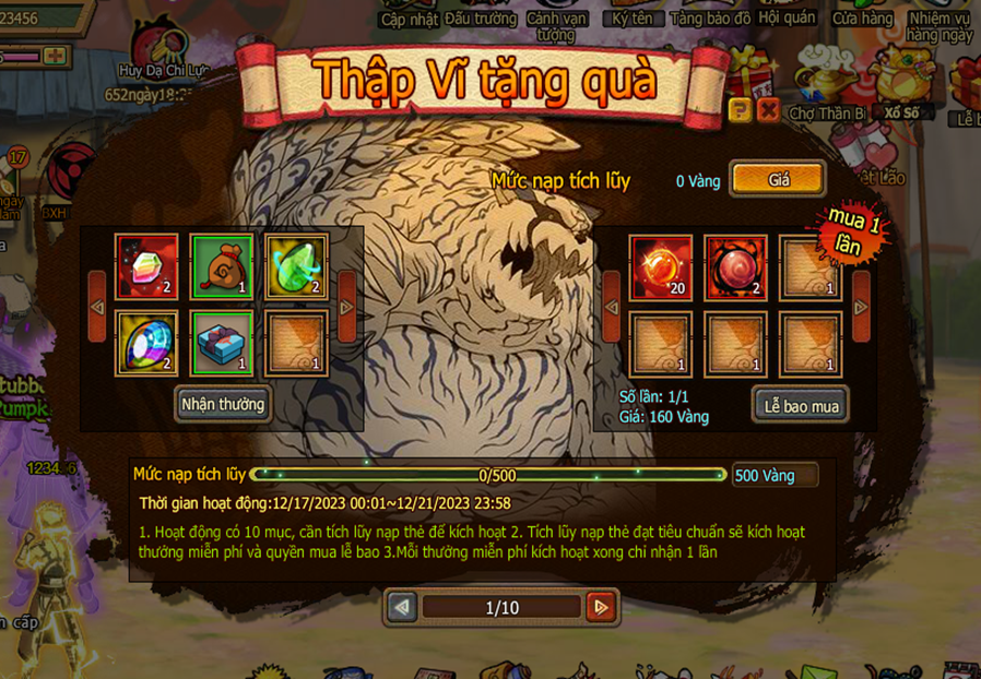 1. Hoạt động có 10 mục, cần tích lũy nạp thẻ để kích hoạt.