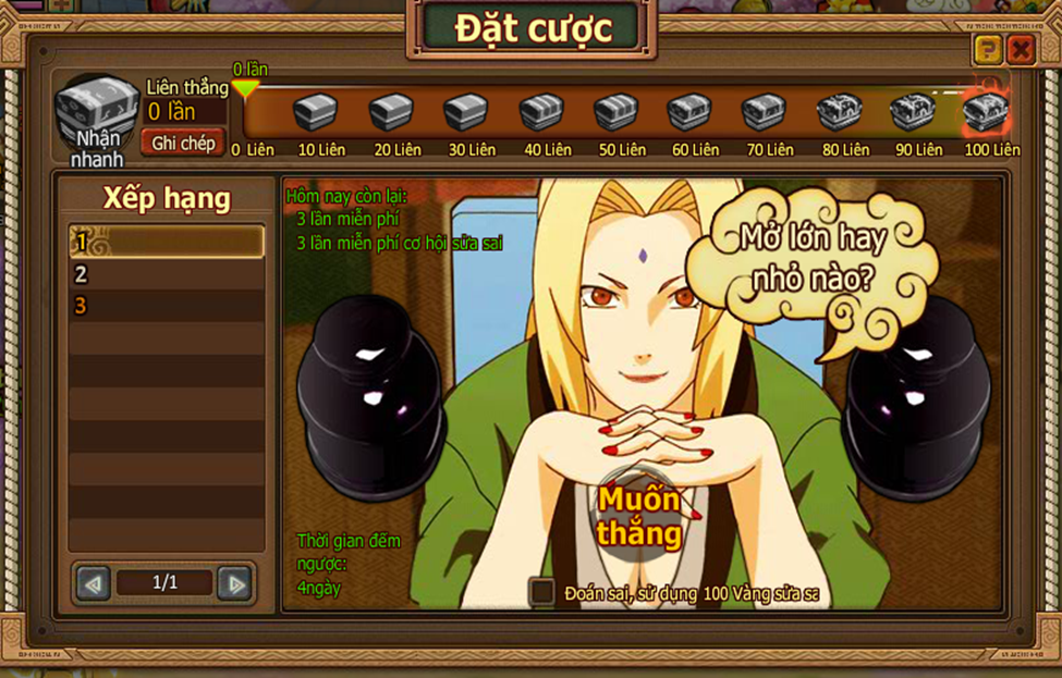 2. Thi đấu bắt đầu khi người chơi điểm số mình lớn hơn hay nhở hơn điểm của Tsunade, nhấn vào nút Lớn hoặc Nhỏ.