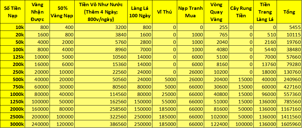 Trong thời gian event nạp 1 lần đạt mức chỉ định , nhận trả lễ vàng .