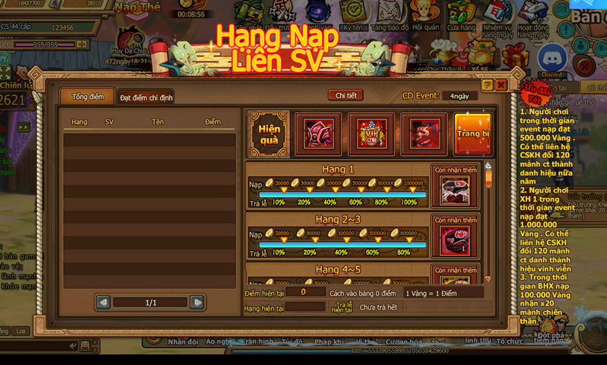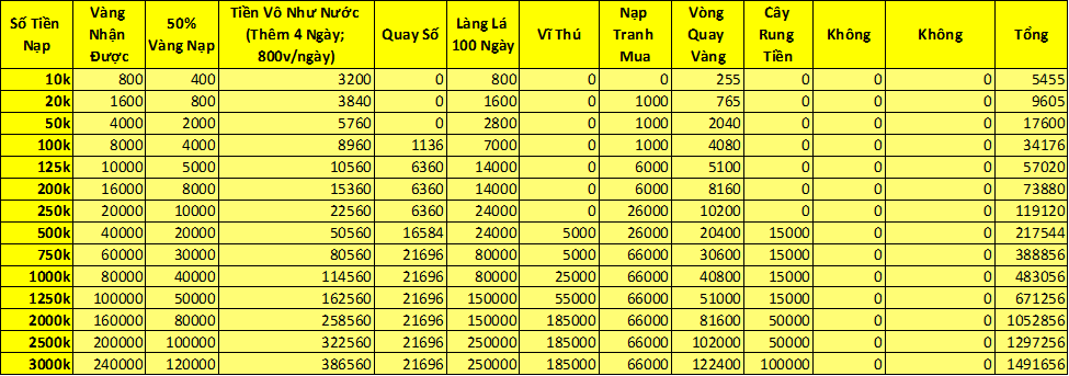 Trong thời gian event nạp 1 lần đạt mức chỉ định , nhận trả lễ vàng