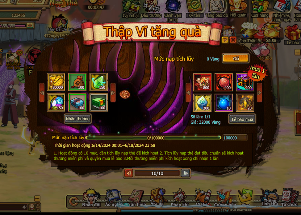 1. Hoạt động có 10 mục, cần tích lũy nạp thẻ để kích hoạt.