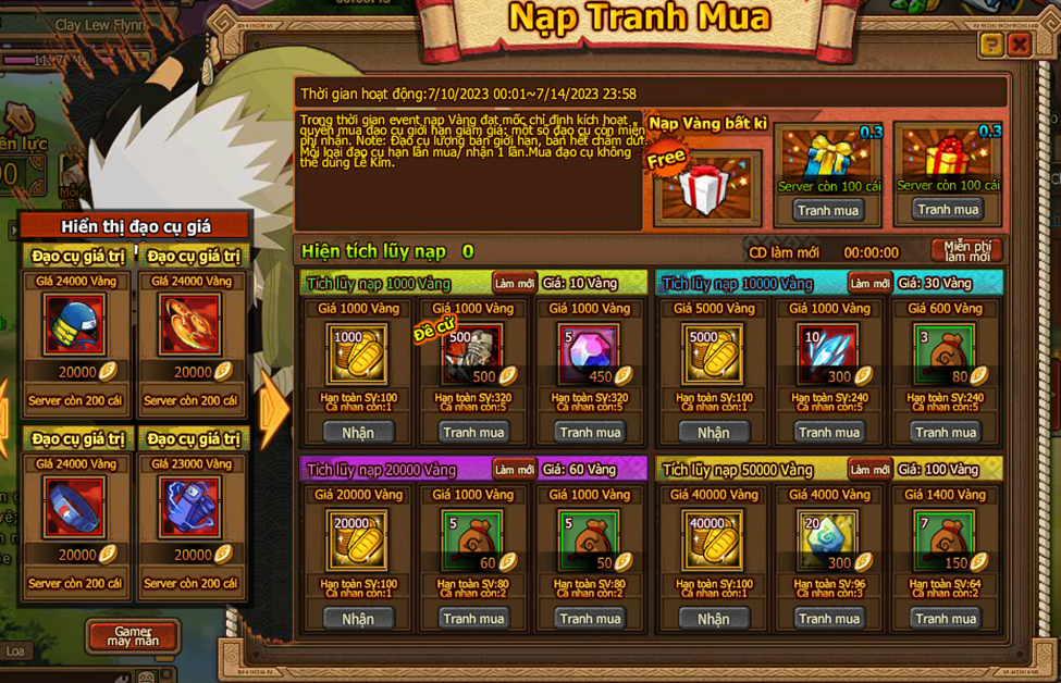 1. Trong thời gian event nạp Vàng đạt mốc chỉ định kích hoạt quyền mua đạo cụ giới hạn giảm giá: một số đạo cụ còn miễn phí nhận.