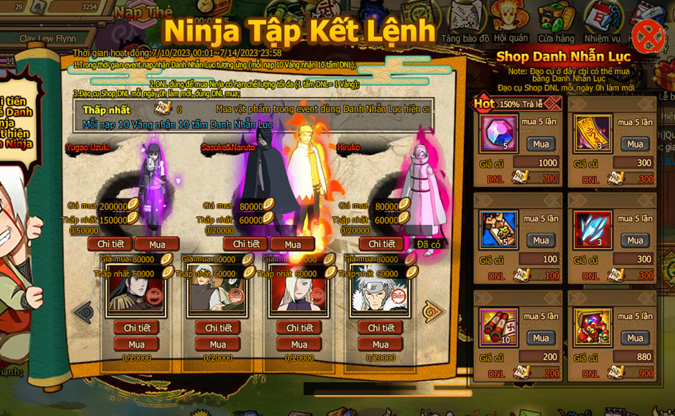 1. Trong thời gian hoạt động mỗi ngày tích lũy nạp đủ mốc tương ứng, mở 4 đại gia tộc, nhận thưởng Huyết kế tương ứng. 4 đại gia tộc gồm: Tộc Hyuga, Tộc Uzumaki, Tộc Uchiha, Tộc Senju.