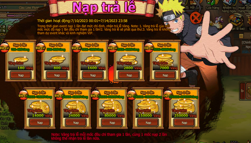 Trong thời gian event nạp 1 lần đạt mức chỉ định , nhận trả lễ vàng .