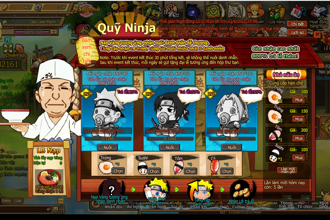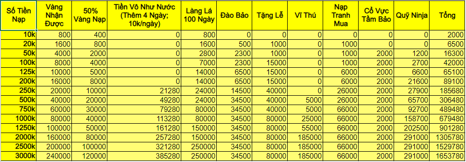 2. Tổng có 3 loại quỹ vàng ,mỗi loại trả lễ khác nhau , có thể nuôi 3 ninja
