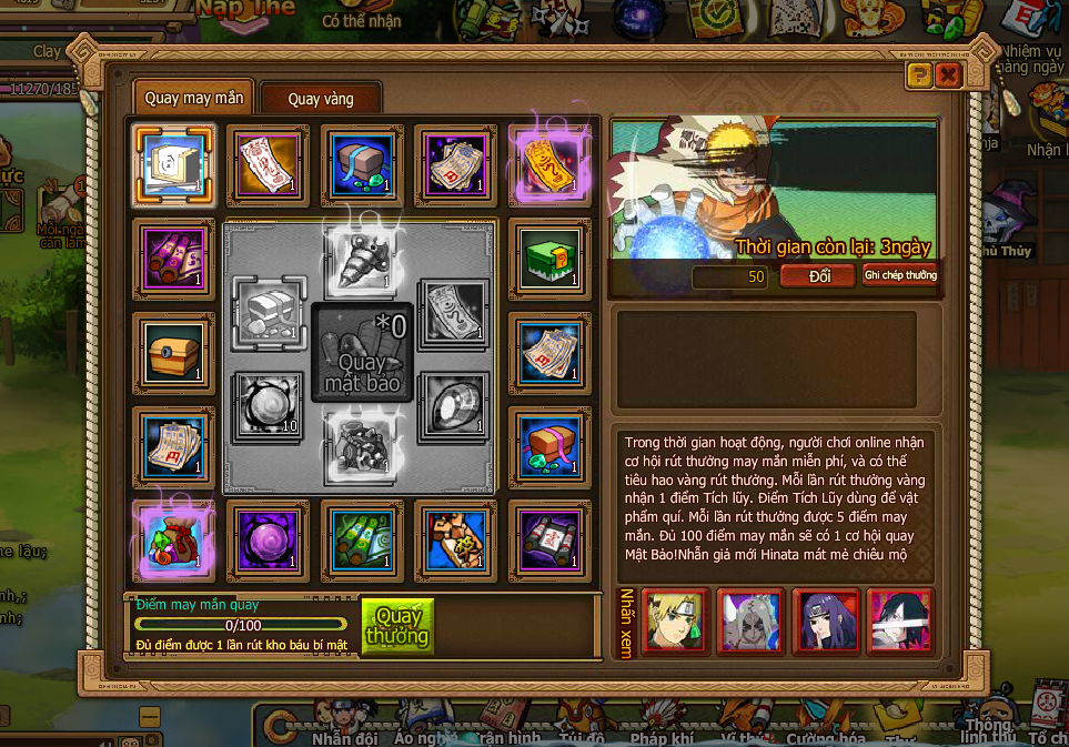 Note : Trước và sau 15 phút thời gian phát thưởng , giải thưởng tạm không làm mới nữa . Mỗi người chơi trong thời gian event chỉ có thể tham dự 1 lần giải thưởng may mắn trả lễ Vàng .