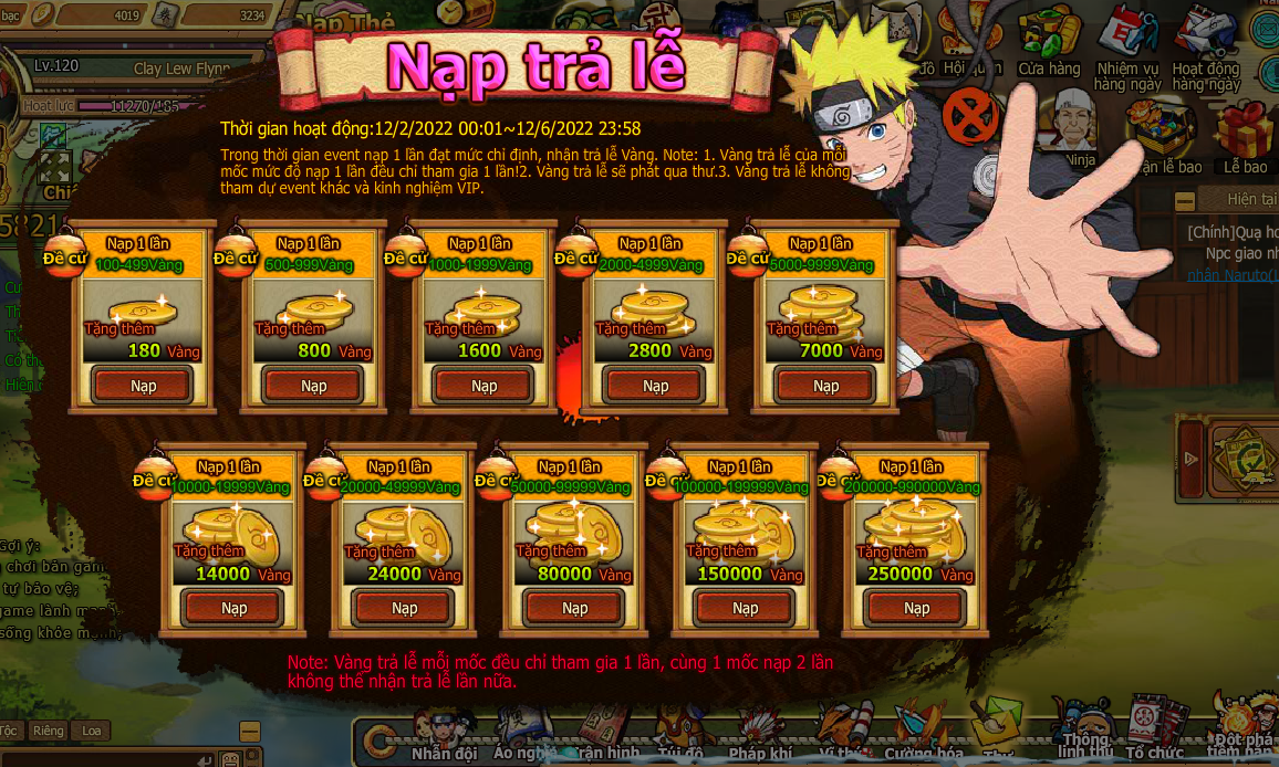 5. Trong thời gian event , nạp 1 lần đầu tiên thỏa nhận thêm bảo tàng khoáng . Trong thời gian , thống kê mức nạp của người chơi toan sv đến giải thưởng may mắn , Mổi nạp 1 Vàng giải thưởng tăng 1 Vàng , mỗi ngày 12:00, 18:00, 22:00 rút ngẫu nhiên 3 người chơi may mắn trong người chơi nạp thẻ toàn sv trả lễ Vàng