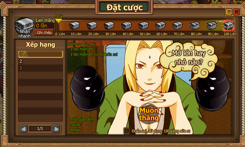 1.Thi đấu bắt đầu khi người chơi điểm số mình lớn hơn hay nhỏ hơn điểm của Tsunade, nhấn vào nút Lớn hoặc Nhỏ