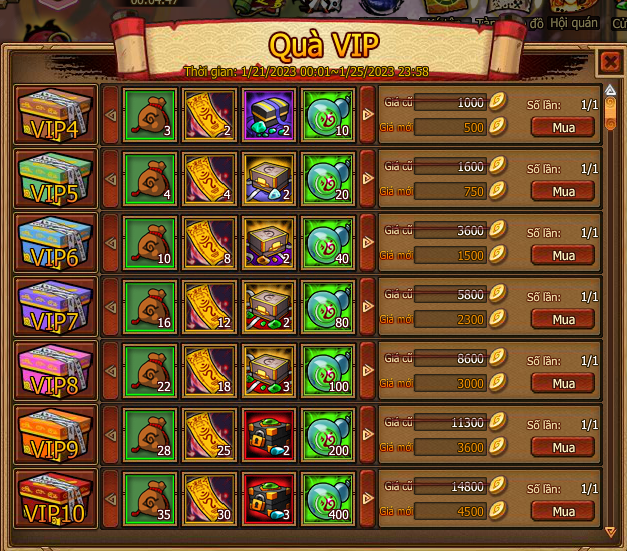 Cấp vip tương ứng sẽ được mua , mua bằng vàng hoặc lễ kim