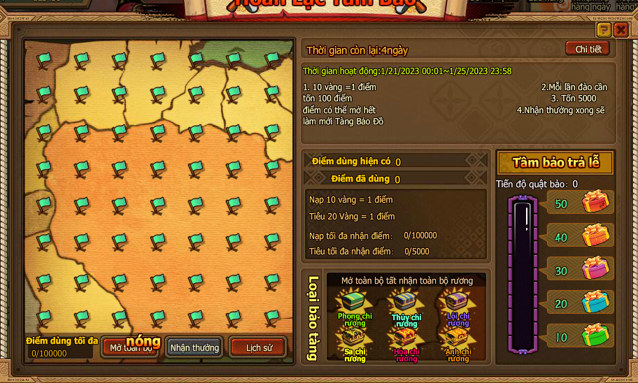 2. Dùng Tàng Bảo Đồ tiến hành mini game Quật Bảo (Tàng Bảo Đồ không đủ dùng Vàng bù đầy, 1 Tàng Bảo Đồ = 50 Vàng).
