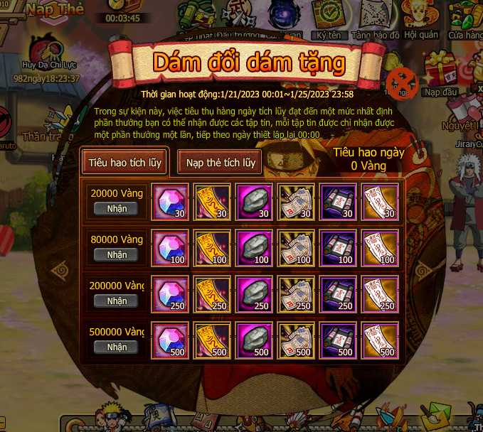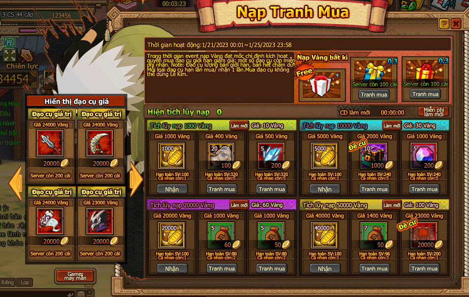 1. Trong thời gian event nạp Vàng đạt mốc chỉ định kích hoạt quyền mua đạo cụ giới hạn giảm giá: một số đạo cụ còn miễn phí nhận.