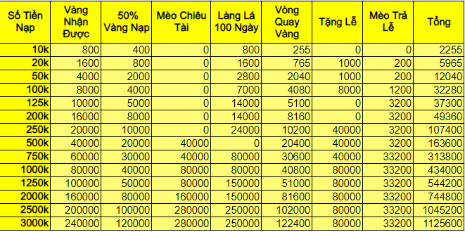 Bảng tính vàng nạp vào sự kiện kỳ này :
