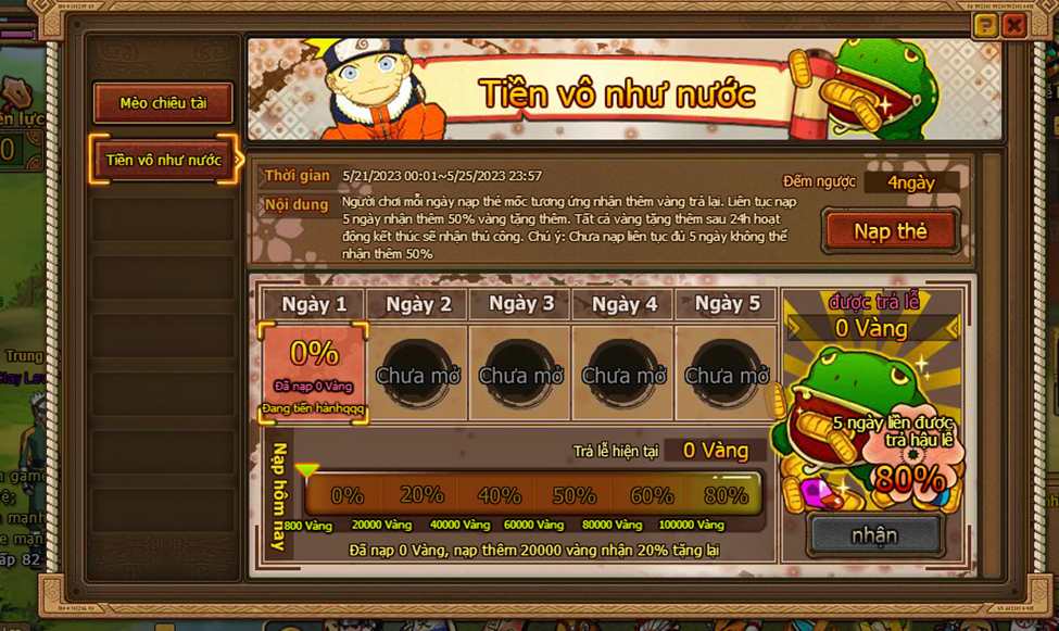 1. Người chơi mỗi ngày nạp thẻ mốc tương ứng nhận thêm vàng trả lại. Liên tục nạp 5 ngày nhận thêm 80% vàng tặng thêm. Tất cả vàng tặng thêm sau 24h hoạt động kết thúc sẽ nhận thủ công. Chú ý: Chưa nạp liên tục đủ 5 ngày không thể nhận thêm 80%.