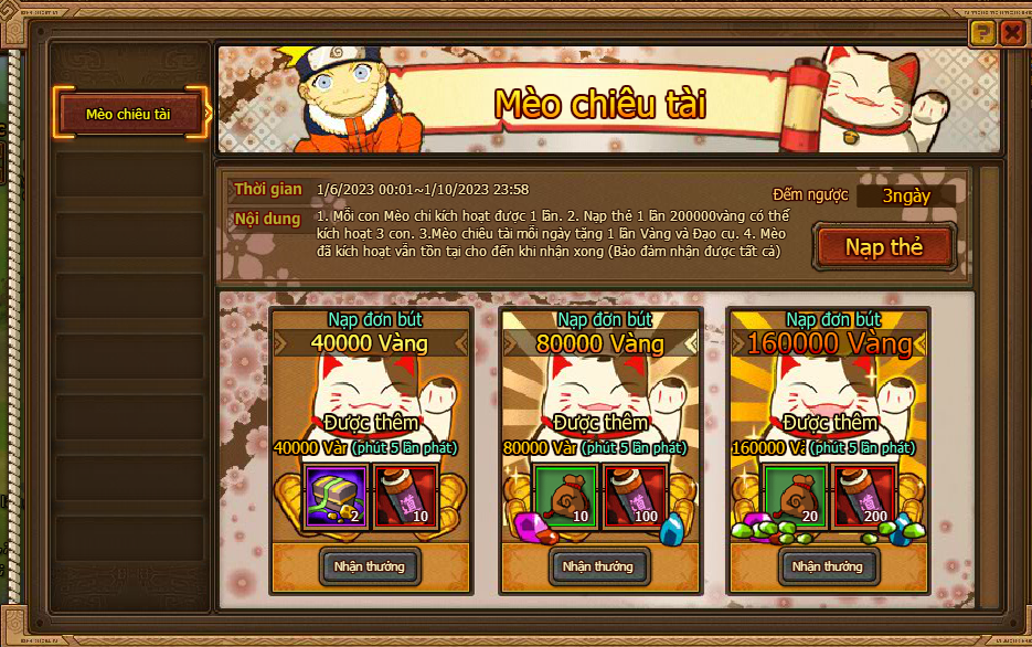 Lưu Ý : nạp 1 lần 200.000 vàng mới nhận cả 3 con mèo