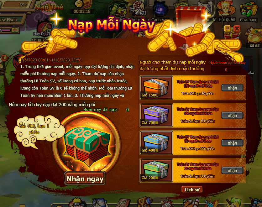 1. Trong thời gian sự kiện, mỗi ngày nạp đạt lượng chỉ định, nhận miễn phí thưởng nạp mỗi ngày.