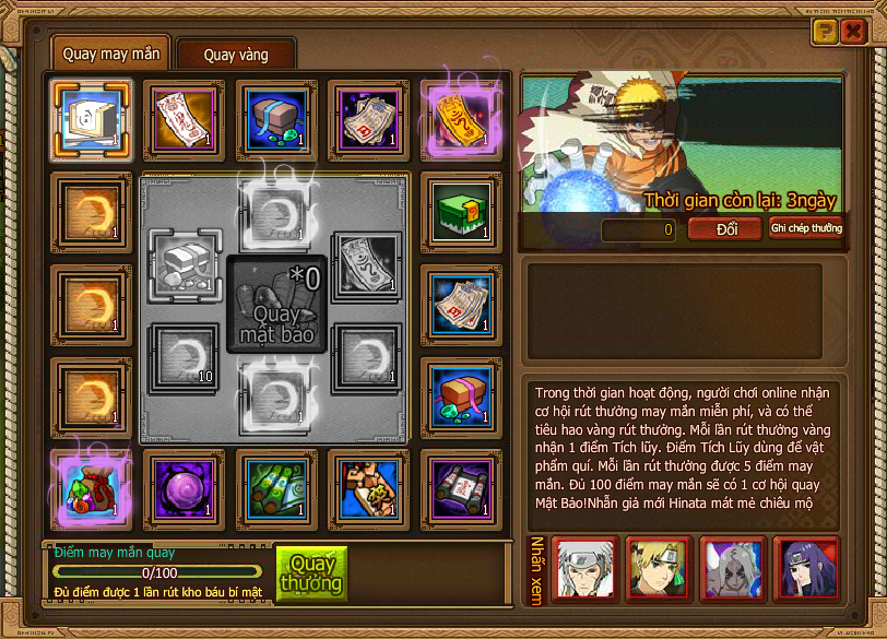 3. Trong thời gian event , người chơi tiêu đủ 1000 vàng nhận 1 lần cơ hội vòng quay lễ kim , mỗi ngày nhiều nhất có thể nhận 20 lần