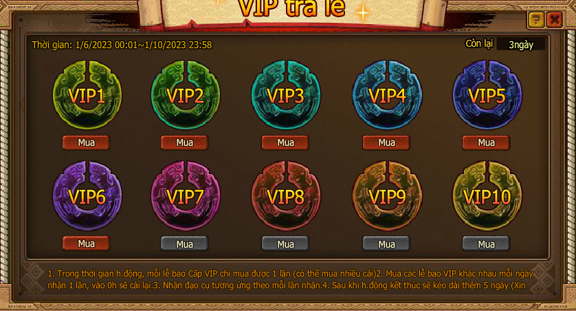 1. Trong thời gian hoạt động, mỗi lễ bao Cấp VIP chỉ mua được một lần (có thể mua nhiều cái)