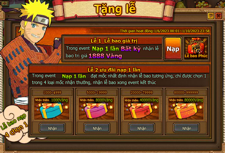 Trong thời gian event nạp 1 lần đạt mức chỉ định , nhận trả lễ vàng .