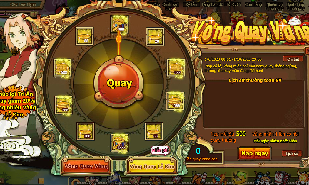 1. Trong thời gian event , người chơi nạp đủ 500 vàng nhận 1 lần cơ hội quay ( vòng quay vàng )