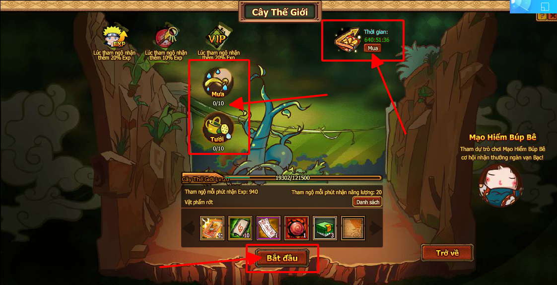 2/ Nút mưa : Dùng để nuôi dưỡng cây thế giới, khi nuôi cây lớn sẽ tăng thêm điểm kinh nghiệm treo máy, điểm kinh nghiệm nuôi cây sẽ tích lũy mỗi ngày
