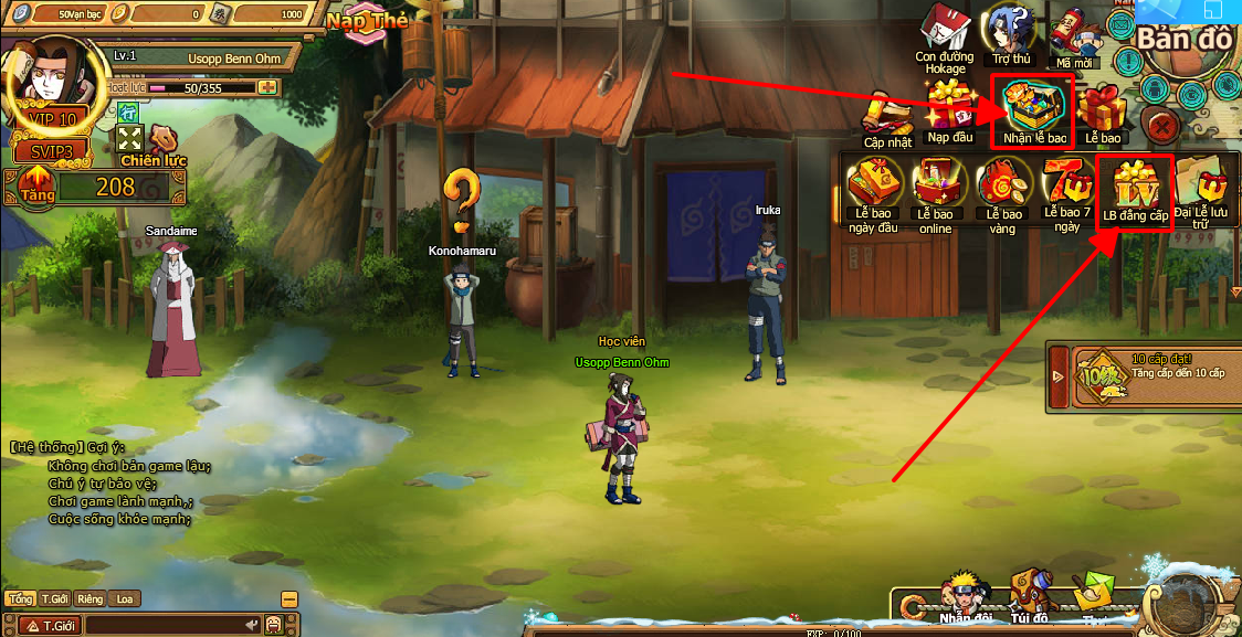 Để tiến hành lên cấp nhanh trong 5 phút quý ninja hãy bấm chọn vào nút quà "Nhận Lễ Bao", sau đó chọn vào nút "LB Đẩng Cấp" để nhận vật phẩm tăng cấp nhanh nhé