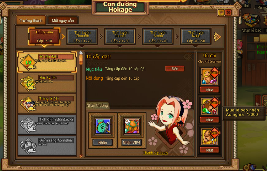 Ở các mốc cấp khác nhau (Cấp 1~10, 10~20, 20~30, 30~40 …) sẽ mở những nhiệm vụ và ưu đãi khác nhau . Vậy nên khi khi các bạn lên cấp thì hãy nhấp vào Con đường Hokage để có thể mua được những vật phẩm (hộp ngọc, phù pháp khí, hoạt lực,…) cần thiết để không bị thọt đồ so với người khác .