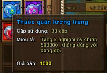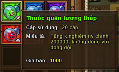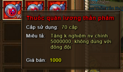 Có 4 loại thuốc quân lương như hình trên dùng để tăng cấp nhân vật chính, nhân vật chính đạt cấp 120 và cấp tiêm năng đạt 100 thì có thể chuyển sinh