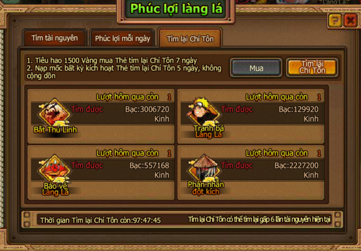 Lưu ý: để kích hoạt được tìm lại chí tôn cần: Tiêu hao 1500 vàng mua thẻ tìm lại Chí Tôn 7 ngày hoặc Nạp môt mốc bất kì kích hoạt thẻ tìm lại Chí Tôn 5 ngày ( không cộng dồn ) .