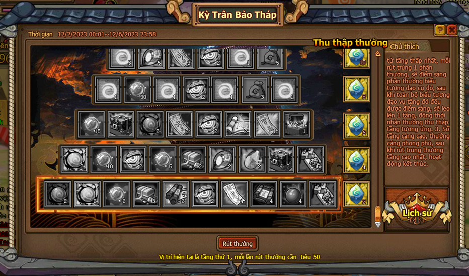 1. Từ tầng thấp nhất, mỗi rút trúng 1 phần thưởng, sẽ điểm sáng phần thưởng biểu tượng đạo cụ đó đều được điểm sáng, sẽ leo lên 1 tầng, đồng thời nhận thưởng thu thập tầng tương ứng.