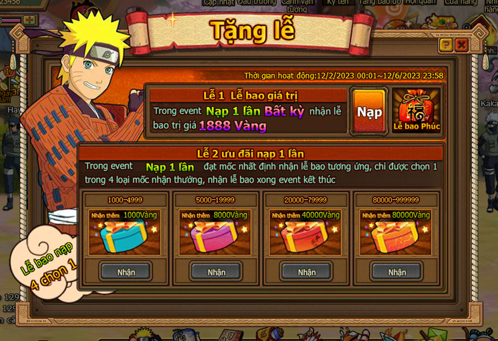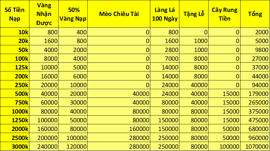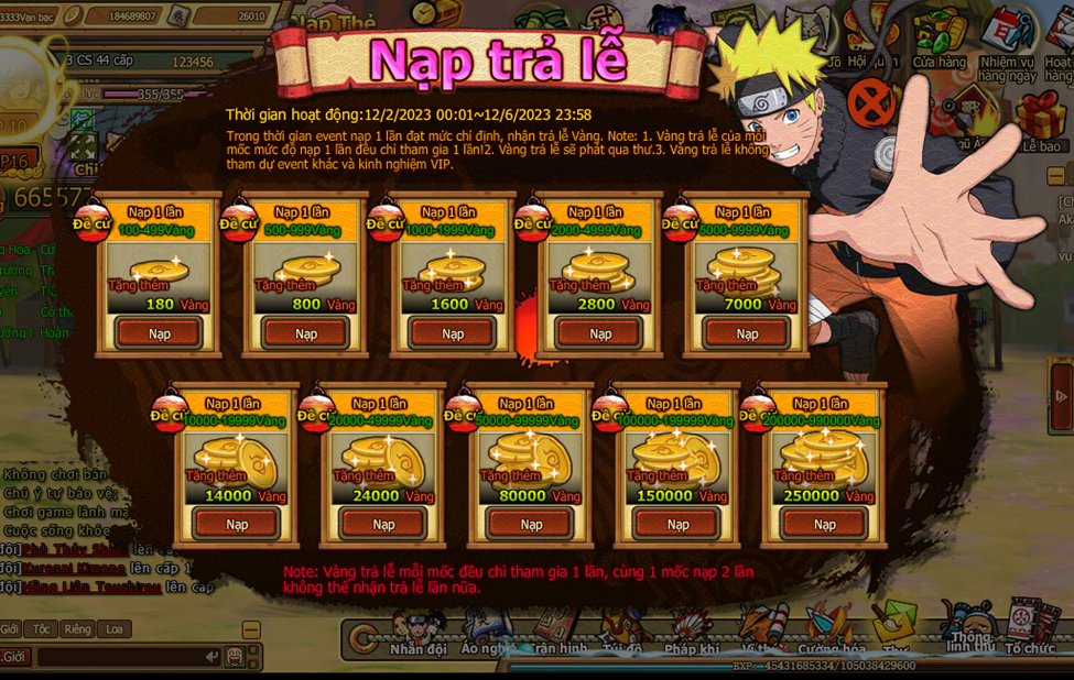 Trong thời gian event nạp 1 lần đạt mức chỉ định , nhận trả lễ vàng .