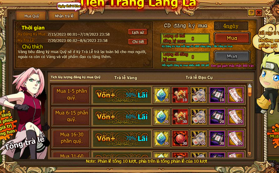 Người chơi căn cứ số phần mua Quỹ mỗi ngày nhận 1 lần Quỹ thưởng trả lễ , trả lễ bao gồm trả lễ vàng và đạo cụ