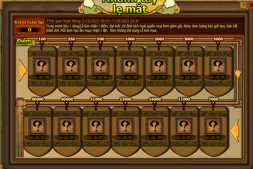 Trong event tiêu 1 vàng/ lễ kim nhận 1 điểm , đạt mốc chỉ định kích hoạt quyền mua item giảm giá