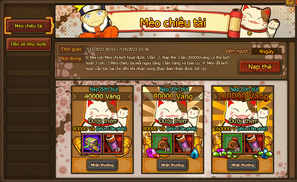 3. Mèo chiêu tài mỗi ngày tặng 1 lần Vàng và đạo cụ.