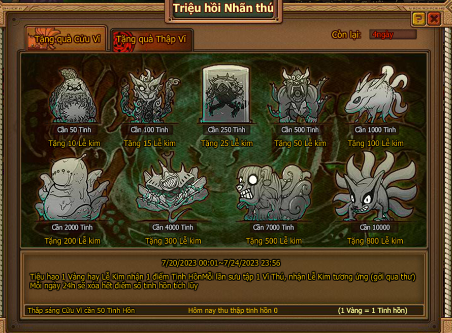 4. Tiêu hao 1 vàng/ lễ kim nhận tinh hồn , thu thập đủ điều kiện nhận rương quà qua thư