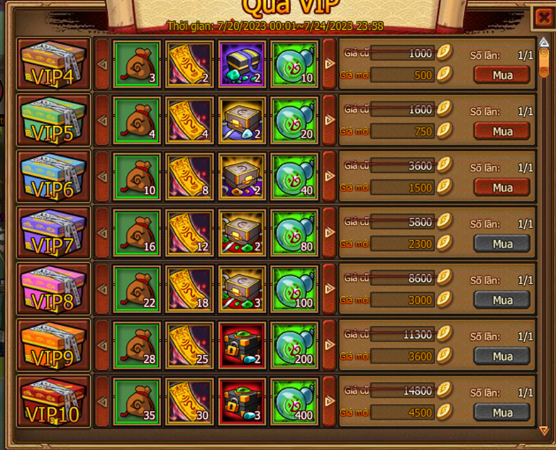 Cấp vip tương ứng sẽ được mua , mua bằng vàng hoặc lễ kim