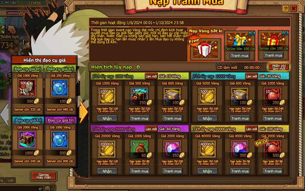1. Trong thời gian event nạp Vàng đạt mốc chỉ định kích hoạt quyền mua đạo cụ giới hạn giảm giá: một số đạo cụ còn miễn phí nhận.