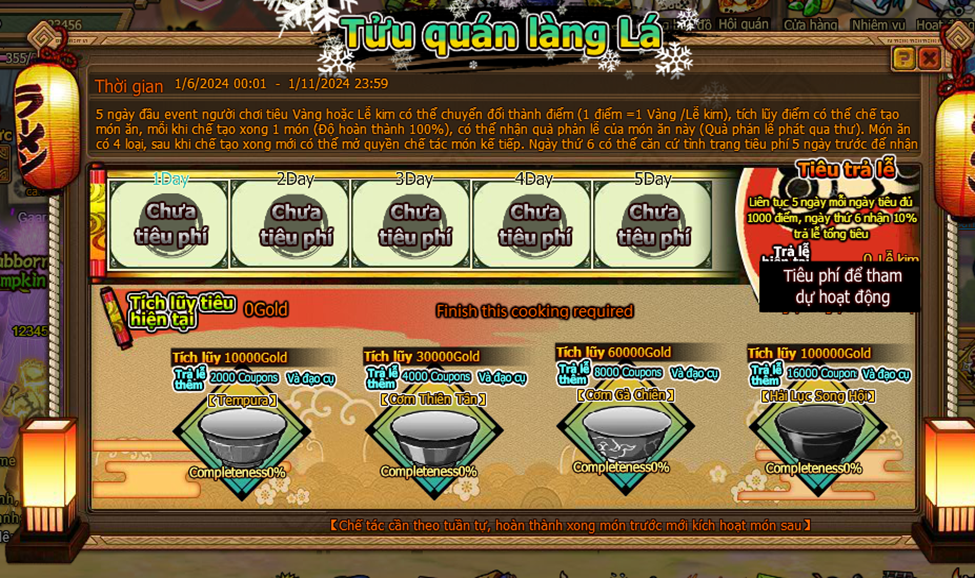1. 5 ngày đầu event người chơi tiêu Vàng hoặc Lễ Kim có thể chuyển đổi thanh điểm ( 1 điểm = 1 vàng / lễ kim )