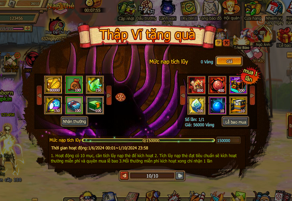 1. Hoạt động có 10 mục, cần tích lũy nạp thẻ để kích hoạt.