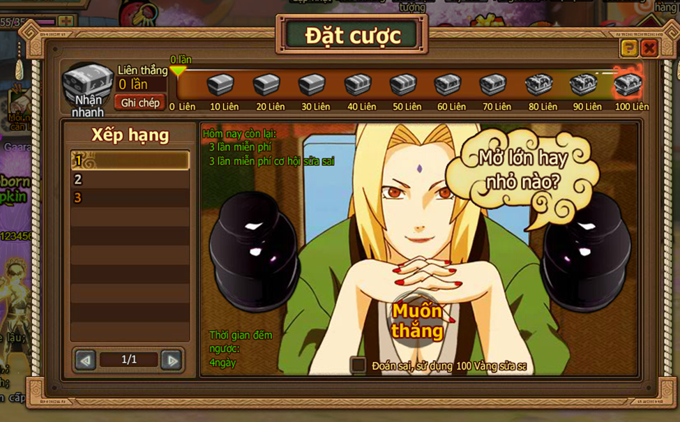 2. Thi đấu bắt đầu khi người chơi điểm số mình lớn hơn hay nhở hơn điểm của Tsunade, nhấn vào nút Lớn hoặc Nhỏ.