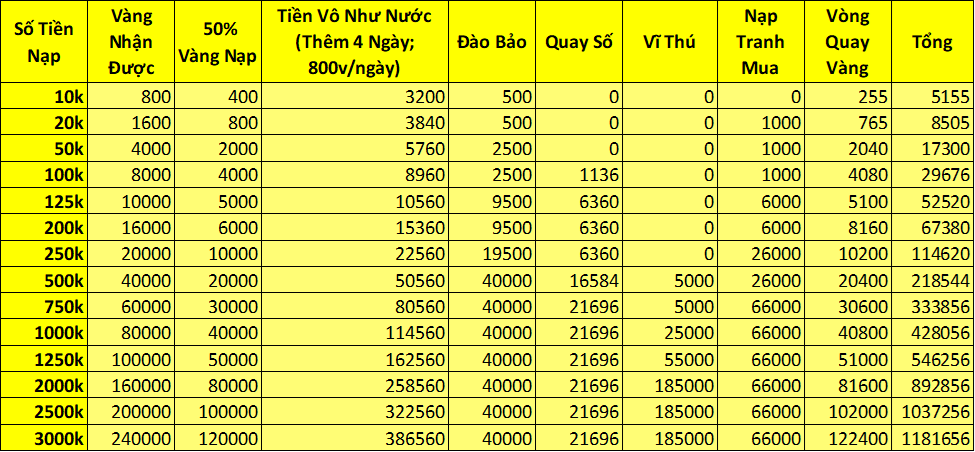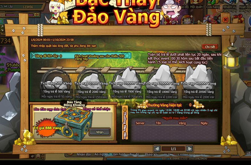 5. Trong thời gian event , nạp 1 lần đầu tiên thỏa nhận thêm bảo tàng khoáng . Trong thời gian , thống kê mức nạp của người chơi toan sv đến giải thưởng may mắn , Mổi nạp 1 Vàng giải thưởng tăng 1 Vàng , mỗi ngày 12:00, 18:00, 22:00 rút ngẫu nhiên 3 người chơi may mắn trong người chơi nạp thẻ toàn sv trả lễ Vàng